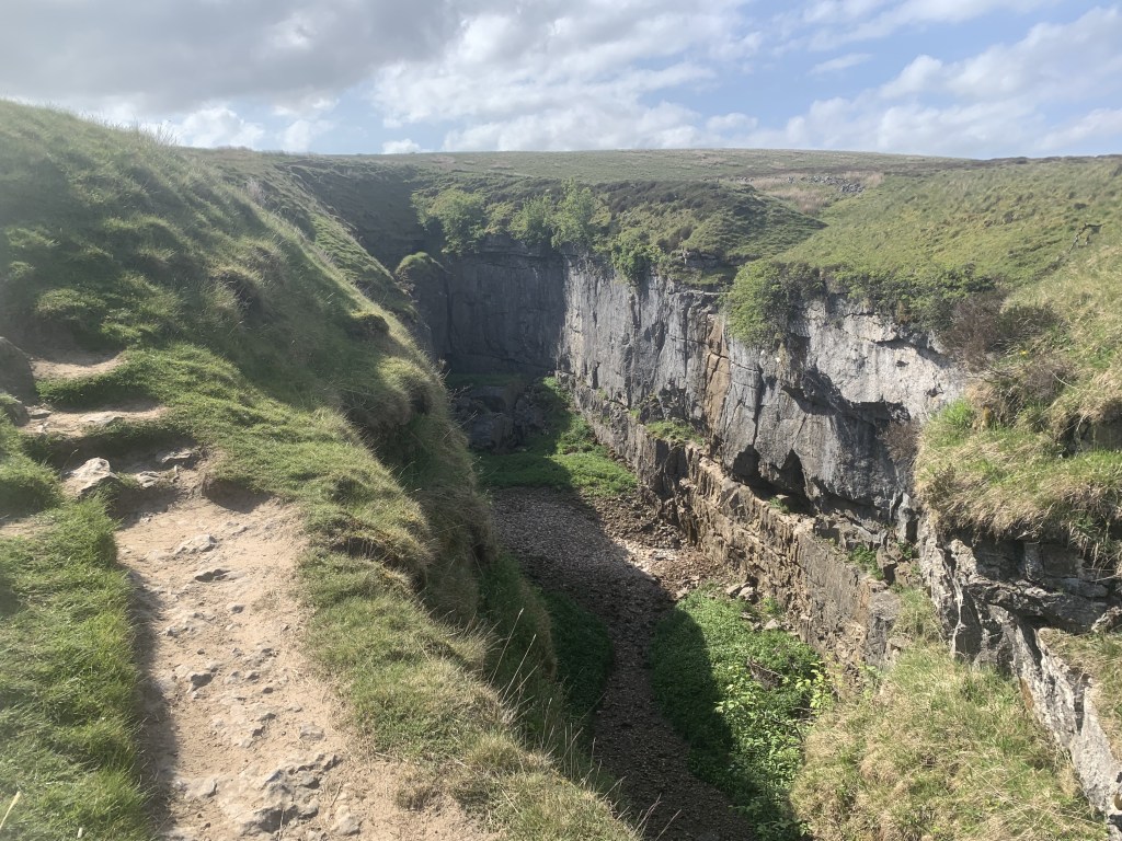 The final point of interest on the walk is on the journey from Pen y Ghent to the end point of the walk, Horton in Ribblesdale. Hull Pot is a collapsed cavern on the western side of Pen y Ghent and, after heavy rainfall, there is also a waterfall within it. Unfortunately, this was not the case when we were there but, I can’t complain because it was beautiful weather. I believe that the cavern is used for rock climbing and potholing/caving. However, it is still a very cool site to see as a walker.