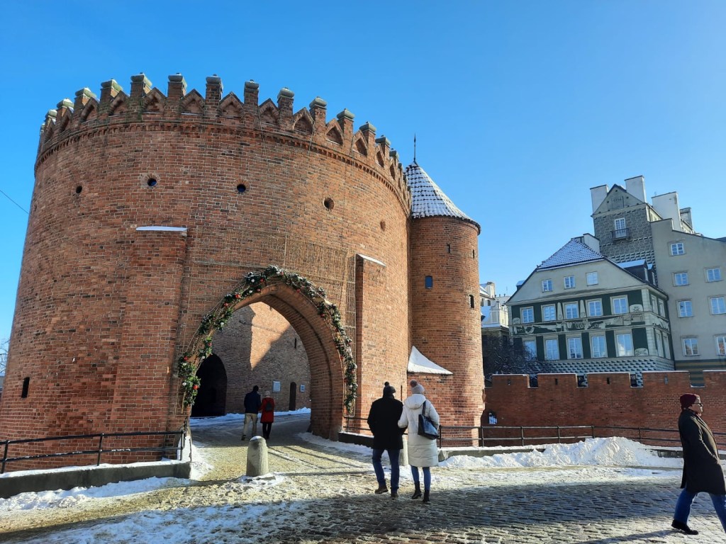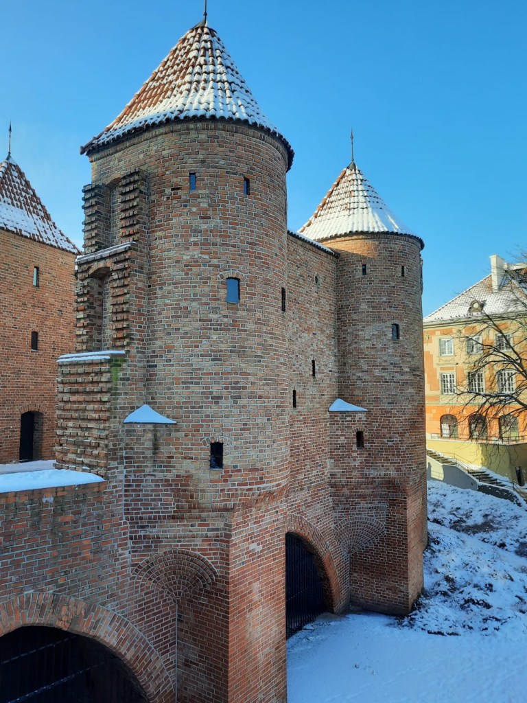 As you walk deeper into Old Town you come across Old Town Market Square which was very busy when we visited as it was home to stalls and an ice rink. I’m not sure if this was all of Warsaw’s Christmas markets – I doubt it – but, its something to be aware of if you’re coming at Christmas time. The square is one of the oldest areas of Old Town, although like many areas, it was destroyed during WW2 and had to be restored. It is also home to the Warsaw Mermaid Statue which was created by Hegel and is seen as a symbol of the city. Not too far away is the, Warsaw Barbican. This is one of the few remaining defence walls that used to surround the city. It dates back to around the 1540s and marks the area between Old Town and New Town.