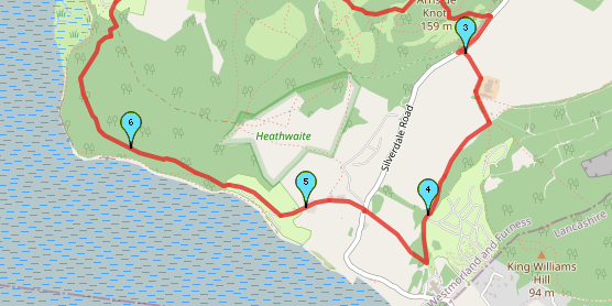 - Once you meet a roundish clearing with a bench, you should take one of the paths on right which will circle you around to the trig point of Arnside Knott.