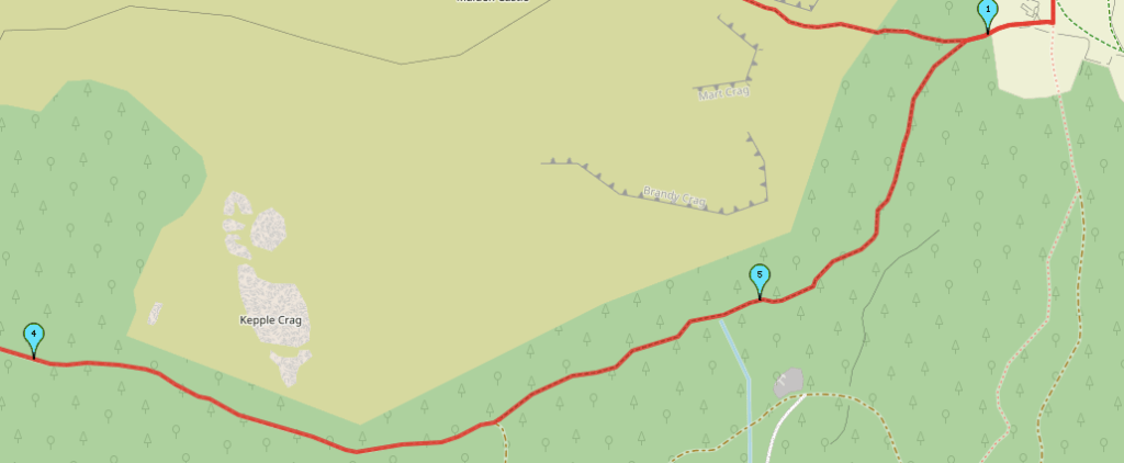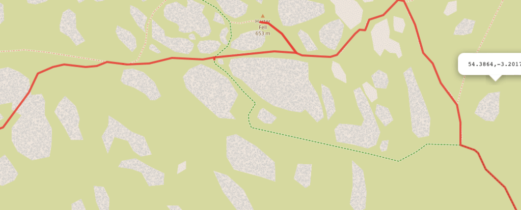 - From the trig point, you need to return back to the path from which you approached it. The OS map suggests you can go in a straight line across the trig point – we didn’t find this to the case so found it easier to retrace our steps. I can’t offer too much advice here as it all depends on the way you reached the trig point and there are many routes. The best I can do is highlight this on the mapspedometer route and recommend you use a compass if you get confused. We headed due south for around twenty metres from the peak stone and then headed to the right (due east).