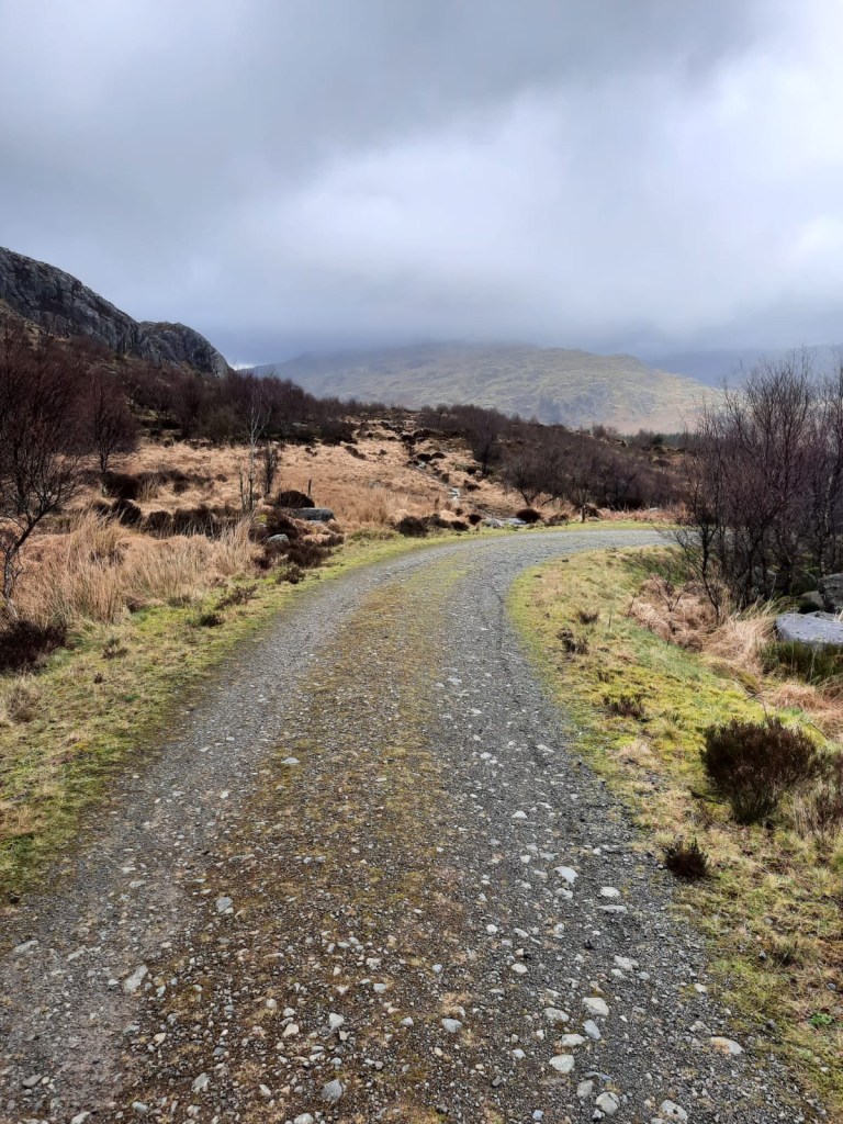 - At the fork, take the path on the left, continuing straight. This soon becomes a gravel track.