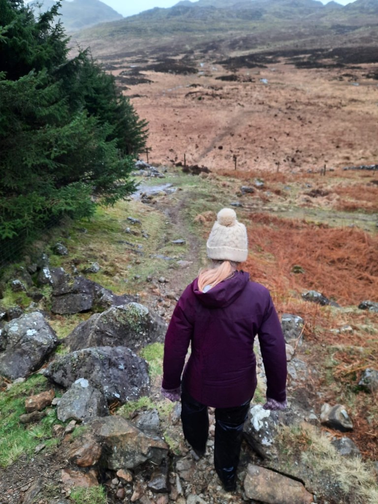 - Continue along the path, soon forking left down a small rocky descent. If the weather permits, you will know you’re on the right path as you will be looking at a valley with a pine forest at the bottom. The right-hand corner of the forest is where you are heading.