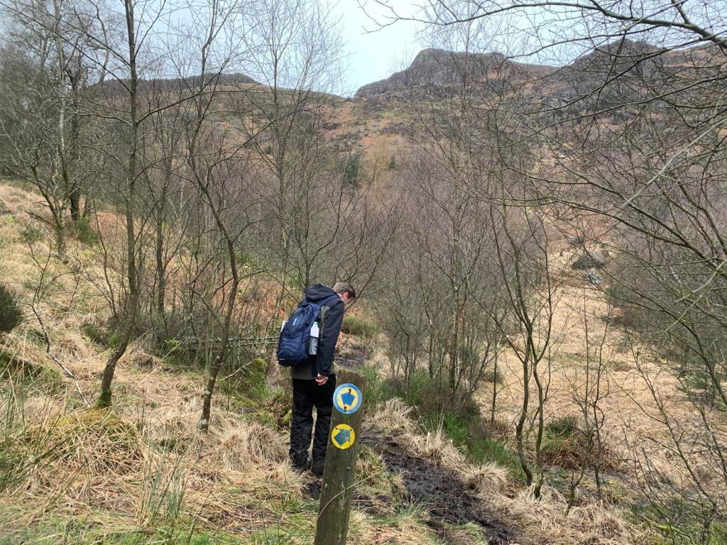 - Almost opposite to that track, there is a path on the right. Take this path which has a stone wall either side of it and a stone enclosure just beyond the entrance to the path. This was also signposted.