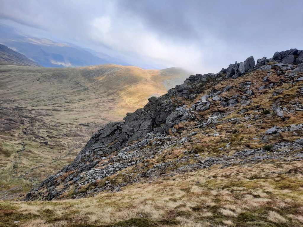 - The path soon descends quite steeply. You may be able to see the rocky climb to Stuc a’Chroin ahead.