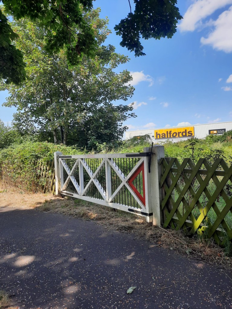 - Continue to follow the river until you get to the roundabout. Cross the road and take the path alongside Halfords, flanked by old railway gates.
