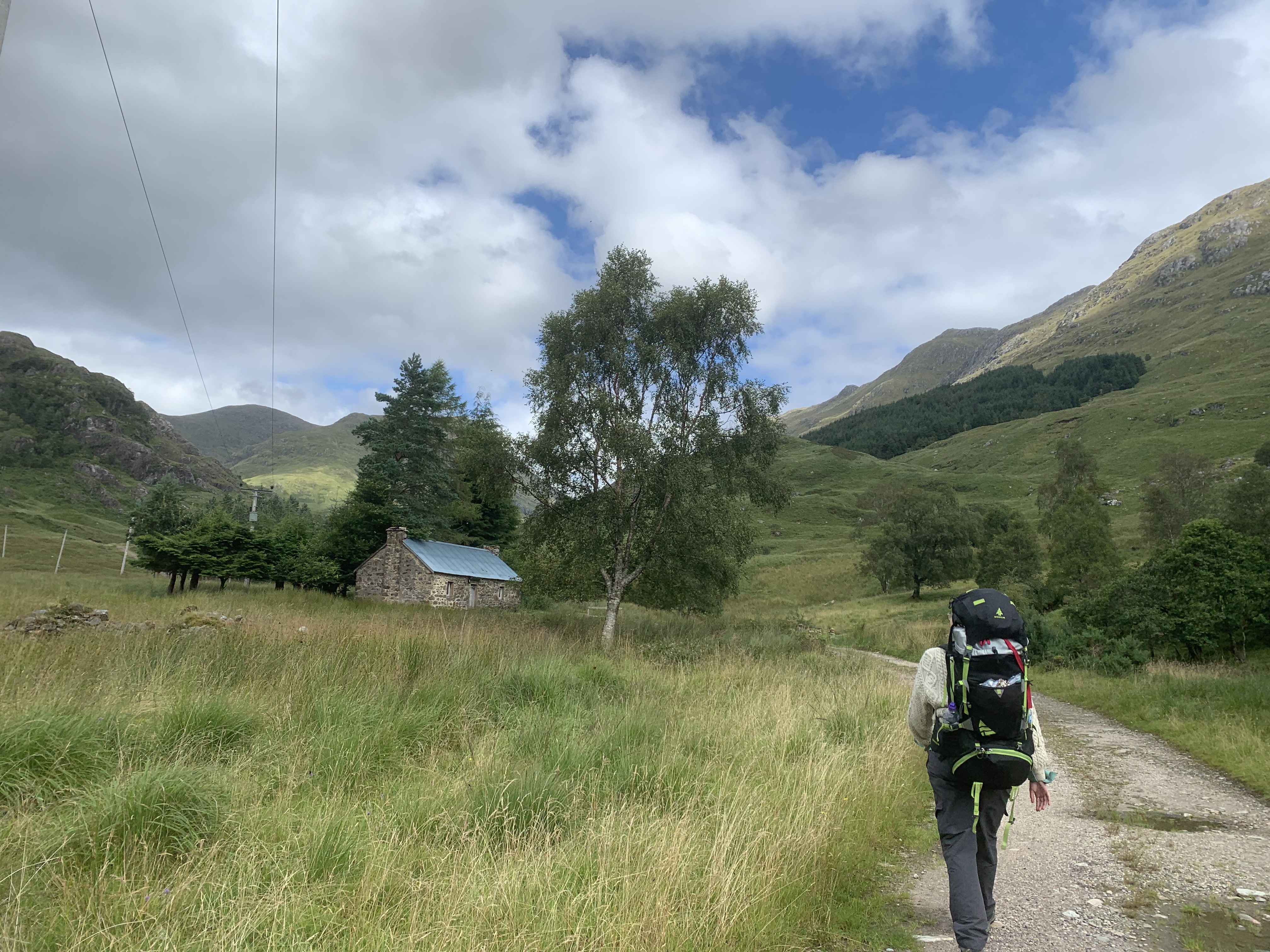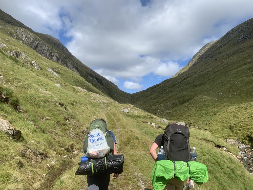 She was lovely though and we parted ways after the 3km as we stopped for lunch. Along this road, there is the first of four bothies on or nearby the route. Corryhully is a spacious bothy that could be used to break this trip into even smaller sectors, especially if you don’t arrive into Glenfinnan until later. This bothy also marks the spot where you depart the road and follow a track instead. After around another km or so, the track gives out and the river forks. At the fork, we headed across the bridge over the river and to the right to begin the climb of day 1. This was where the mental game of this walk really kicked in. I do love camping but, any kind of incline is a struggle for me mentally with a big rucksack on. I really have to take it slow and try not to get too in my head – which I fail at frequently. This is by no means a high peak or anything remotely close to munro-sized. In fact, Bealach Allt n’Chaoruinn is only 483m tall but it felt much more than that at the time.