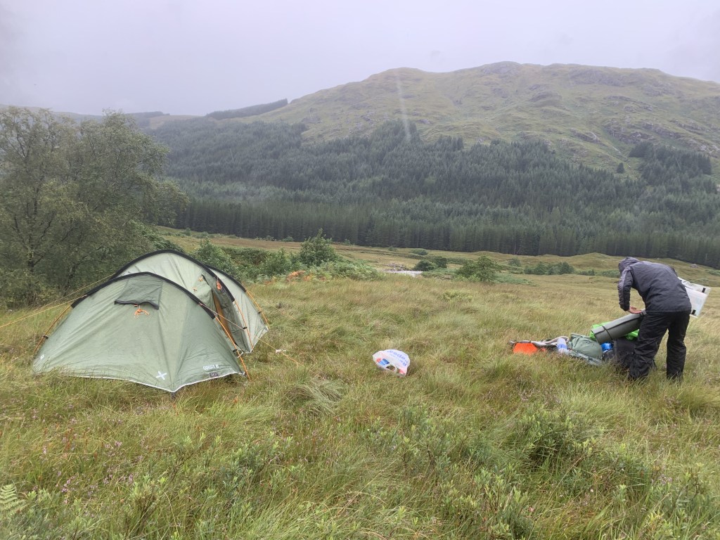 There are two options, well three, for an end-point to day one. We opted to camp near the River Pean, just before the path crosses a bridge and enters the woodland. This was a fine spot however, with torrential rain overnight, the ground became boggy and we woke up with the tent in a bit of a swamp. We were also mobbed by midges in the morning which is not ideal but expected when it comes to Scotland unfortunately. The second option is to head on for an extra 4-5km to A’Chuil which is a bothy maintained by the Bothy Association. We stopped here for breakfast the next morning and, according to the visitors log book, it seemed like we wouldn’t have fit in there anyway; it was incredibly busy! The third and final option is to massively deviate from the route and stay at Glenpean Bothy which is again a 4km addition to the end of the route in the opposite direction. I don’t think that is a very good option but something to be aware of.