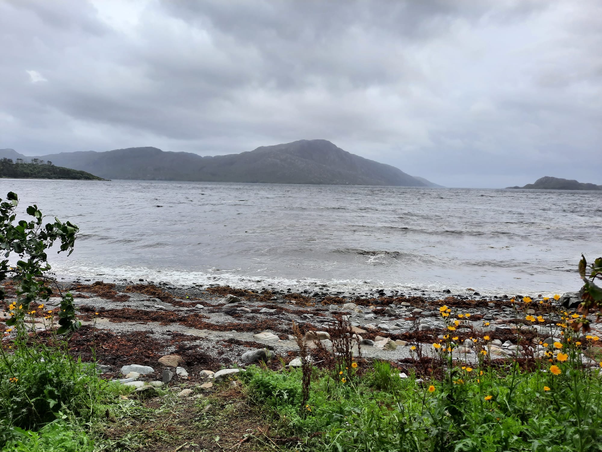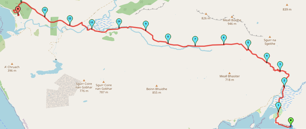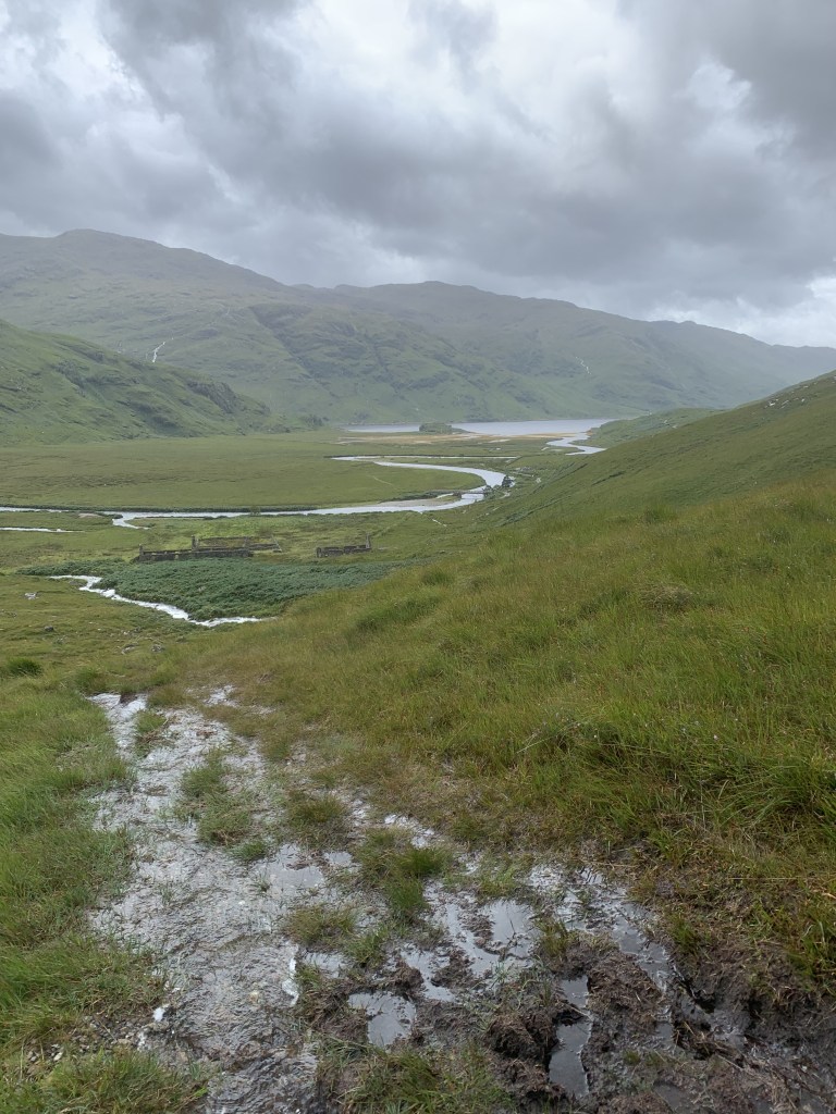 So, we started day three with the knowledge that it had been another night of quite heavy rain and, given the boggy conditions of some areas of the first and second days of the walk, it was same to assume that we were in for the same thing. Adorned with waterproofs, we set off from Sourlies bothy, bidding goodbye to the two men who were heading back towards Glendessary that day. Boy, was that assumption more than correct. The path takes you along the loch and then back inland along what is basically a bit of an estuary. This is where a river meets the sea, or in this case a loch, and the flat surrounding land was incredibly boggy. I’ve plotted the route on mappedometer as it is supposed to be however, in reality, we had to stray from the path in order to make it across to the bridge without getting too wet. We kept to the right hand side of the estuary and then cut across when we could see the bridge and we were almost across from it. In the end, it was a little bit pointless as our feet were wet by the end of it anyway (even with leather boots!).