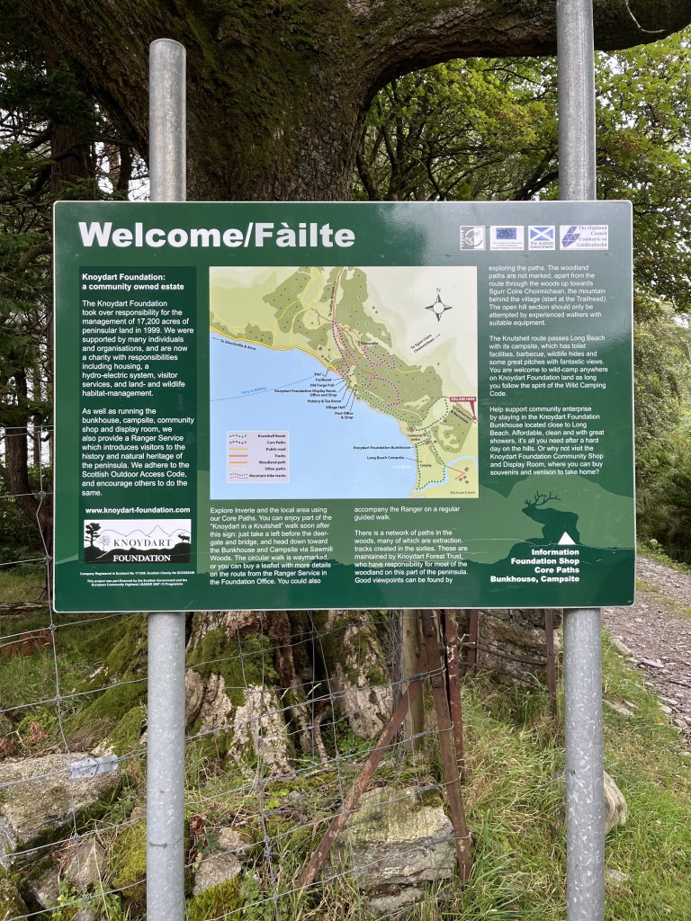 - Continue following the track as it passes through deer gates. Eventually, you will come to a fence which enters a wooded area with signage welcoming you to Inverie.