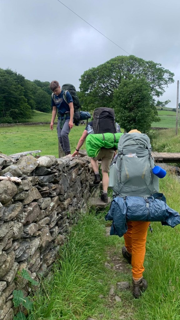 We woke up in the pouring rain at Chapel Stile. Luckily, the campsite had a very handy shelter near the facilities that we could sit under whilst we had our breakfast. Alex and Ed kindly put down the tents whilst the rest of us started heating the water for our porridge. We had known that the weather was going to be bad so, that took away some of the damp mood but, it is always quite miserable setting out in the rain. Unlike on day one though, we had prepared with our waterproofs on ourselves and our bags.