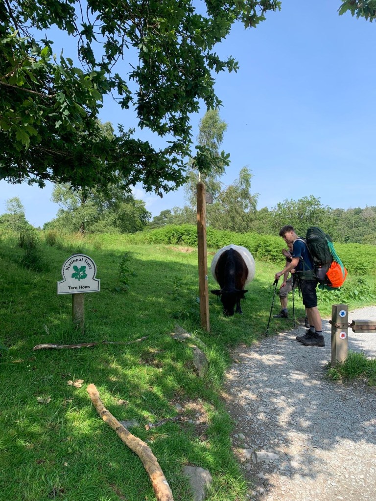 Heading out of Coniston, there is a short climb, and then you head into woodlands. The terrain is vastly different on day two, and the variety greatly helped our mood and progress. It included woodlands, fields, waterfalls, tarns and rivers. One of my favourite parts of the day was passing Tarn Hows, which is a very popular spot in the Lake District but not one that I had ever visited. Belted Galloway cows are free to roam around the water and are an incredible sight! The surrounding hills and the bright summers day made for a great first visit to the tarn and showed it off in all its glory. There is also a cafe here so we had a snack break with an ice tea which went down a treat. From then on we were playing games and singing to pass the time – I highly recommend.