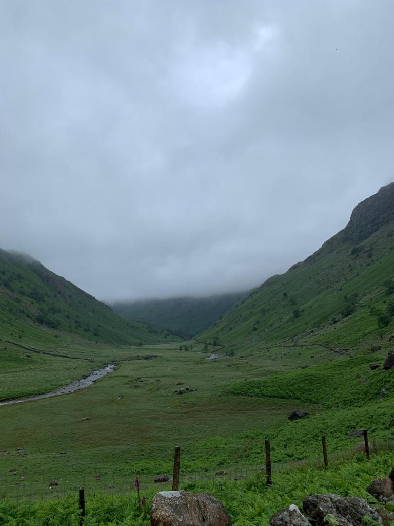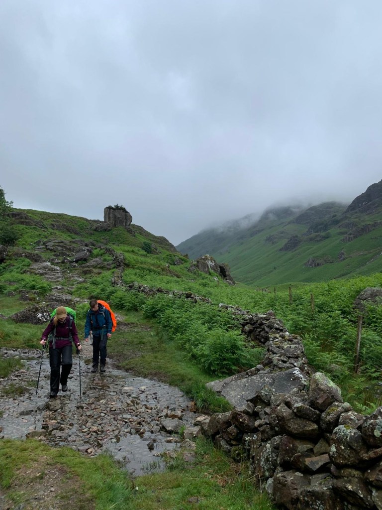 Day three also features the first climb of The Cumbria Way. There is never any significant elevation gain if you’re taking the official route; however, there are two sections that could be considered hilly. One is Stake Pass, which climbs out of the Mickleden Valley and down into Borrowdale. Like with day two, we used singing and games to pass the time as, the foul weather and low visibility weren’t enough to dampen our spirits. In fact, I was enjoying this day very much! It felt like we were well into the Lake District at this point, surrounded by the magnificence of the mountains.