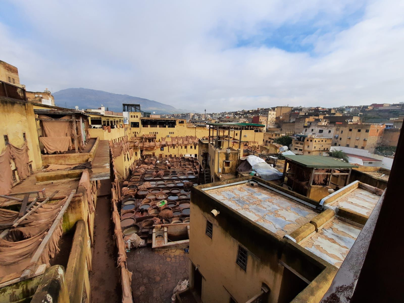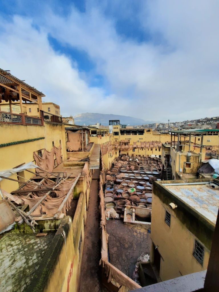 The day began by visiting a tannery which Fez is famous for. In particular, we visited the Tannerie Chouara which is the largest in the city and also one of the oldest. Instead of heading to the tannery itself, it is better to go to one of the many shops offering a ‘free’ visit to their shop balcony to see the tannery. They obviously do this to get you into the shop so that you buy something however, you also do get the best view from above. Tanneries are where leather made. The animal skin is stripped of it’s fur and then dyed using natural ingredients such as turmeric before being dried and used to make the leather products sold around the Medina. The people in the shop told us about the history of the tannery and also gave us mint. Tanneries famously smell terrible but…I didn’t think it was all that bad. We did go fairly early in the morning though by Morocco’s standards – things don’t tend to get going until midday.